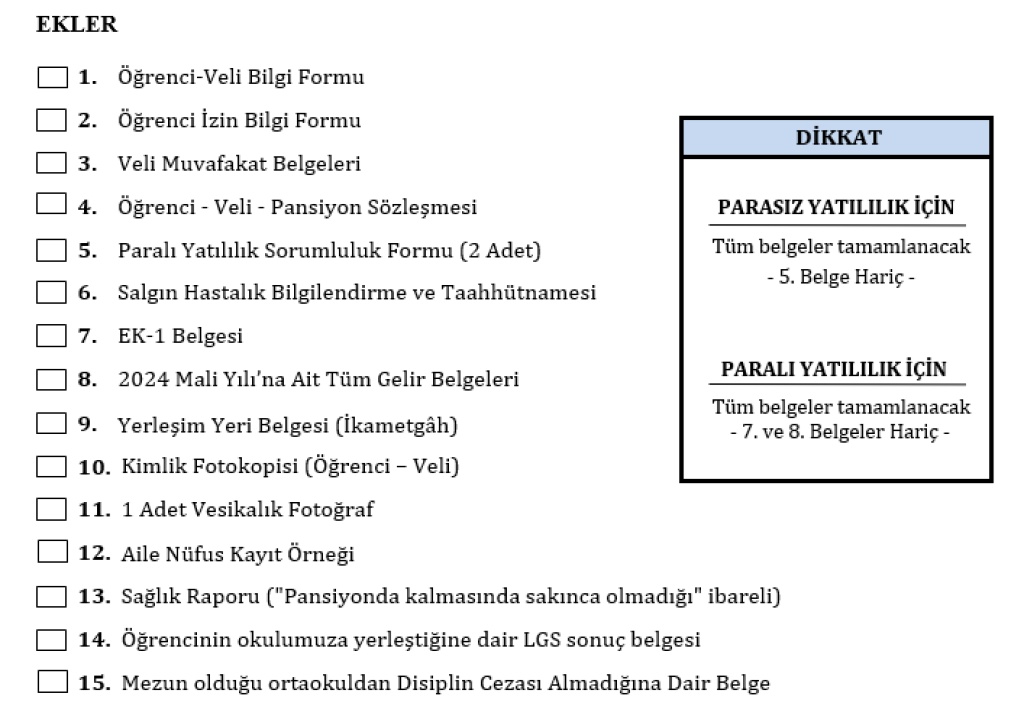 3. ADIM | BURAYA tıklayarak Pansiyon Kayıt Evrakları'nı indiriniz ve de kayıt türünüze uygun belgeleri tamamlayarak okula teslim ediniz. |